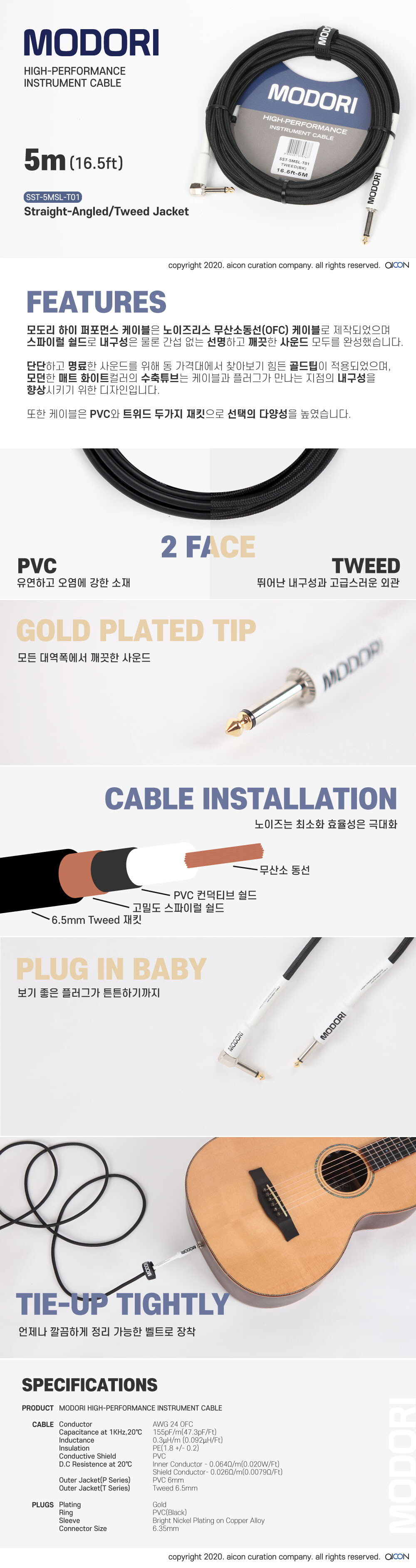 MODORI 기타 베이스 키보드 트위드케이블 SST-5MSL-T01